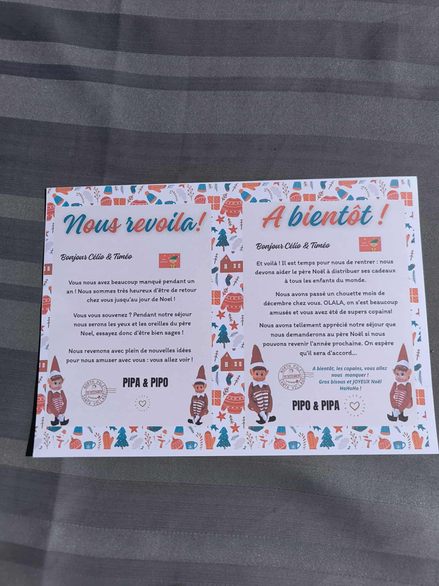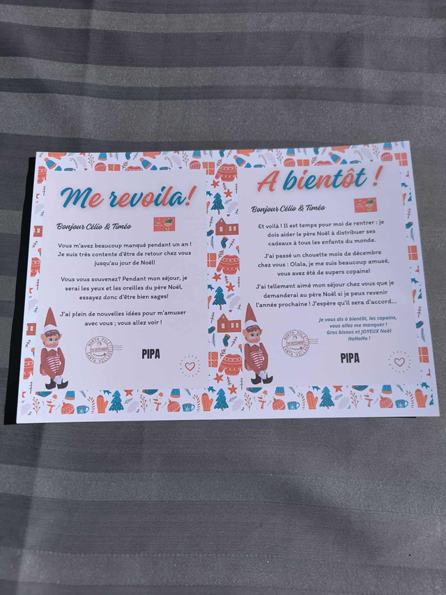 Faites entrer vos lutins farceurs dans la maison avec encore plus de magie grâce à nos lettres personnalisées 🎄🧝♂️📩 Lettre d’arrivée :Déposée le 1er jour, elle annonce aux enfants l’arrivée de leur lutin/lutine.Disponible en plusieurs versions :LutinLutineCouple de lutins📩 Lettre de départ :À glisser le dernier jour, elle explique que le lutin repart au Pôle Nord pour aider le Père Noël 🎅.Elle existe également en version :LutinLutineCouple de lutinsTextes amusants et tendres pour faire rêver les enfantsImpression sur papier de qualitéPersonnalisation avec le prénom des enfants et des lutinsDisponible en pack (arrivée + départ) ou séparémentRituel magique à intégrer dans vos traditions de Noël 🎄👉 Une façon simple et féerique de rendre l’aventure des lutins encore plus vivante et inoubliable 💫➡️ Au moment de vouloir valider votre panier à droite il est écrit "Message à l'attention du commerçant"Le/les prénom(s) de(s) lutin(s)