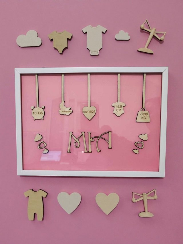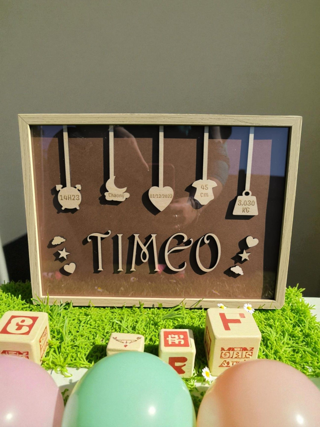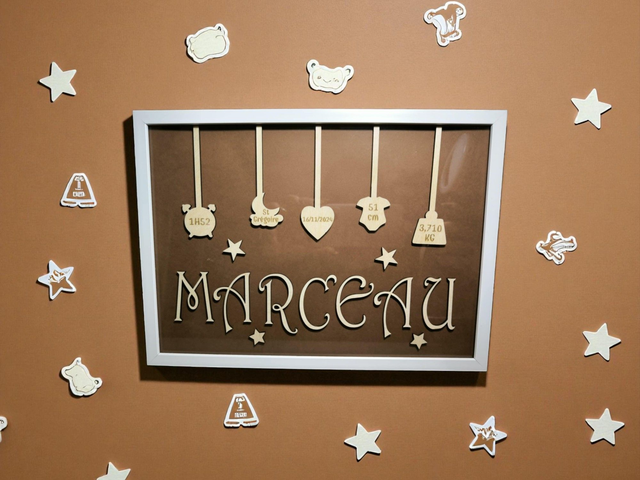 Offrez un souvenir unique et plein d’émotion 💝 avec ce cadre de naissance en bois gravé ! Le prénom, la date, l’heure ⏰, le poids ⚖️, la taille 📏 et la ville 🏡 sont joliment suspendus sur des formes symboliques (réveil, lune, cœur...).