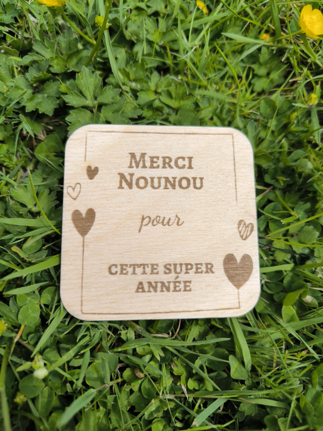 🧲 Magnet personnalisé pour Nounou – 3 formes au choix 💕Un petit mot doux qui reste collé au cœur… et sur le frigo ! Nos magnets en bois sont parfaits pour remercier une nounou en or en fin d’année ✨ 3 formes au choix : rond, carré ou cœur, à sélectionner selon vos envies. Chaque magnet est gravé avec un texte déjà proposé, mais peut être entièrement personnalisé selon vos mots 💬 Au dos, vous pouvez faire graver le prénom de l’enfant ainsi que l’année scolaire pour un souvenir unique et touchant 🖋️💡 Dimensions :Rond & Carré : env. 7.5 cmCœur : env. 8.5 cm de large➡️ Lors de la validation de votre panier, à droite "Message à l'attention du commerçant" : merci d’indiquer le texte à graver sur le devant, ainsi que le prénom + l’année à graver au dos (si vous le souhaité) 📩 Pour toute question : 0664219396.