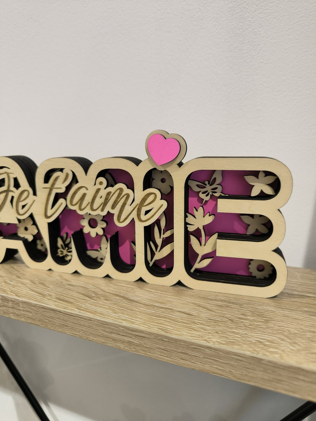 🌼 Le mot MAMIE est mis en valeur par un effet relief délicat, accompagné d’un joli mot “Je t’aime” et d’un petit cœur décoratif ❤️ Les motifs floraux apportent une touche douce et poétique, parfaite pour embellir un intérieur 🏡