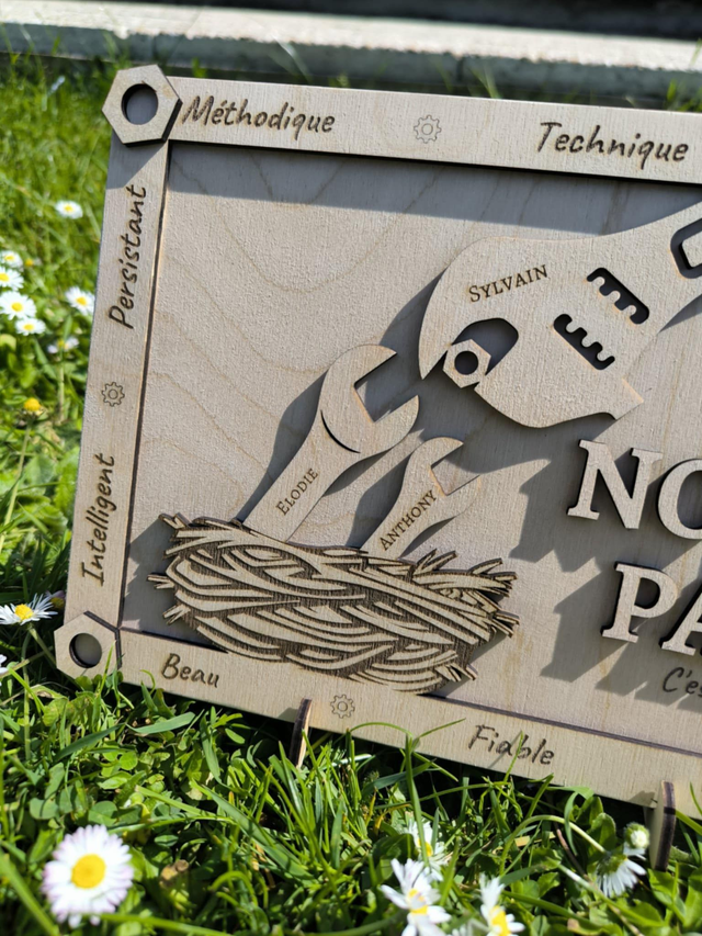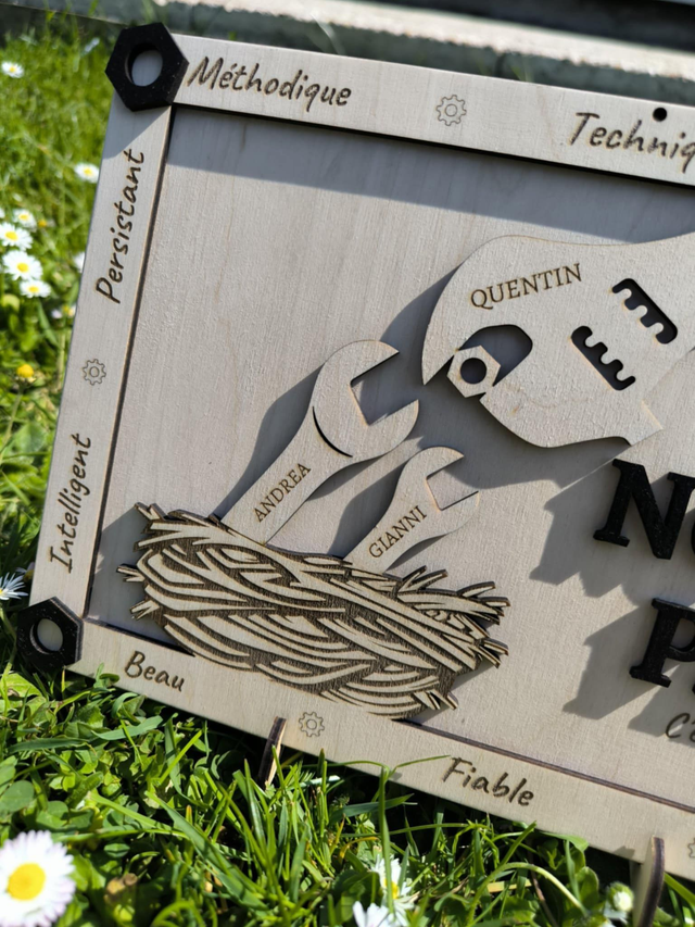 Offrez un cadeau unique pour la Fête des Pères !Une grande clé à molette gravée au prénom du papa 🧰, entourée de petites clés (jusqu’à 6) avec les prénoms des enfants 🛠️.Au centre, le mot "NOTRE PAPA" est en relief, disponible en finition bois naturel ou noir 🖤.Autour, des mots qui le définissent : méthodique, technique, qualifié, intelligent, passionné, gentil, fiable, beau, persistant, ingénieur 🔥.Chaque coin est orné d'un boulon (bois ou noir) pour un rendu authentique 🧩.💡 Dimensions : Largeur: 27.7cm Hauteur: 18cm Epaisseur: 6mm➡️ Lors de la validation de votre panier, à droite "Message à l'attention du commerçant" :merci d'indiquer le prénom du papa, les prénoms des enfants (6 max), et les mots à modifier si besoin.📩 Pour toute question : 0664219396.