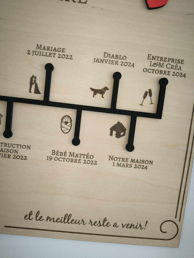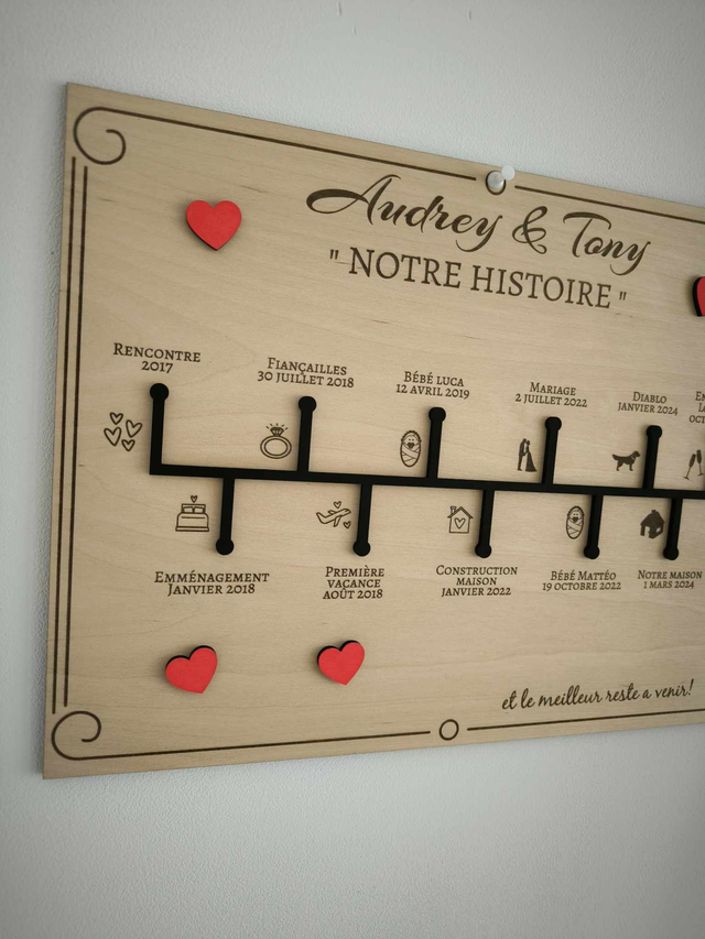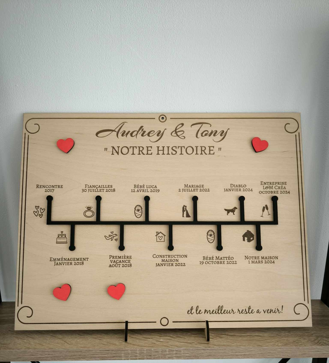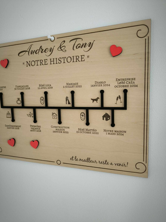 Pancarte "Saint-Valentin"Ce panneau est une façon unique de vous rappeler les plus beaux moments de votre vie de couple. Cette pancarte est une idée de cadeau de Saint Valentin unique qui rassemble toutes les dates importantes du couple, de leur première rencontre jusqu'à leur mariage, enfants, voyages .....Dimensions :Pancarte totale approximative > Largeur : 36cm Hauteur : 27cm Épaisseur : 3mmAu moment de vouloir valider votre panier, à droite il est écrit "Message à l'attention du commerçant"Merci de m'indiquer dans le cadre les informations suivantes pour la pancarte : Les prénoms + les dates et l'évènement concernant (pour toute question vous pouvez m'envoyer un message privé au 0664219396)