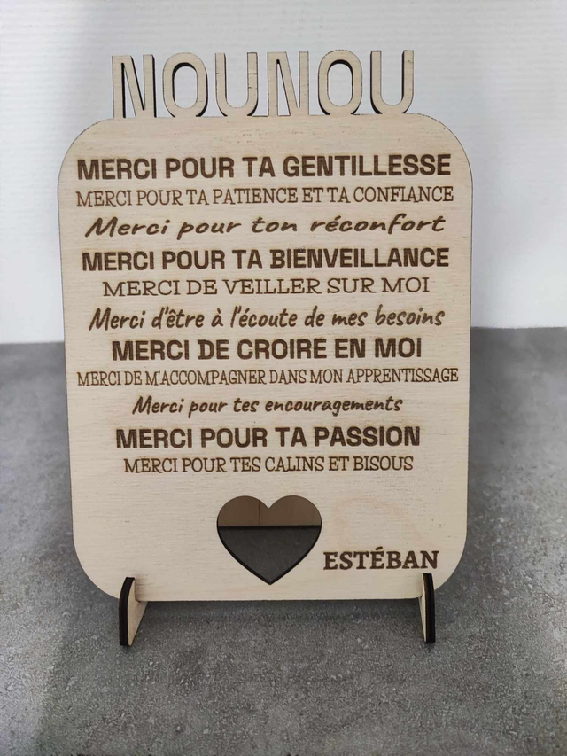 Pancarte Nounou avec pied La personnalisation au niveau du Nounou peut-être changé Mesure avec nounou inclus largeur 14cm / hauteur 18.7cm Au moment de vouloir valider votre panier il est écrit "Message à l'attention du commerçant" Merci de m'indiquer dans le cadre les informations suivantes : ce que vous souhaitez en haut de la pancarte, le prénom de l'enfant (pour des informations complémentaires envoyez-moi un message au 0664219396)