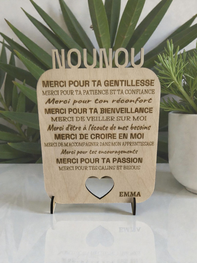 Pancarte Nounou avec pied La personnalisation au niveau du Nounou peut-être changé Mesure avec nounou inclus largeur 14cm / hauteur 18.7cm Au moment de vouloir valider votre panier il est écrit "Message à l'attention du commerçant" Merci de m'indiquer dans le cadre les informations suivantes : ce que vous souhaitez en haut de la pancarte, le prénom de l'enfant (pour des informations complémentaires envoyez-moi un message au 0664219396)
