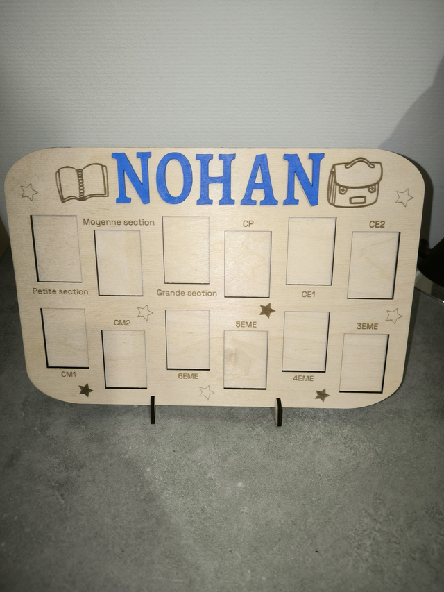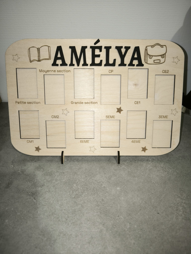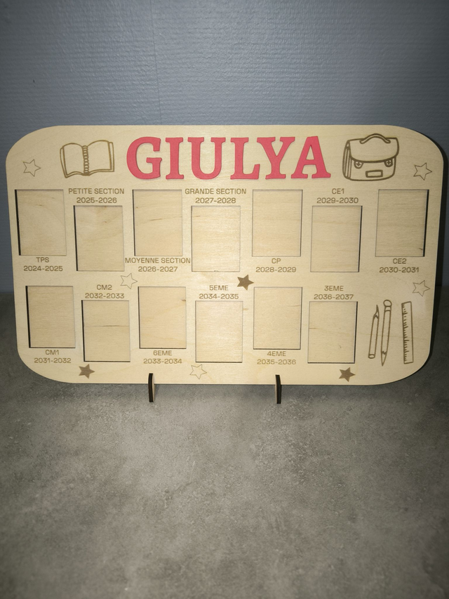 Cadre photo écoleCouleur du prénom possible : Bleu, Vert, Rouge, Noir et MarronDe la petite section a la 3éme , il est possible de rajouter les annéesDimensions:Pancarte totale approximative > Largeur : 30cm Hauteur : 20cm Épaisseur : 3mmTaille des photos approximative : > Largeur : 3.4cm Hauteur : 5cmAu moment de vouloir valider votre panier il est écrit "Message à l'attention du commerçant"Merci de m'indiquer dans le cadre les informations suivantes pour le cadre : le prénom + si vous souhaitez les dates ou pas et m'indiquer les dates pour chaque année (pour toute question vous pouvez m'envoyer un message privé au 0664219396)