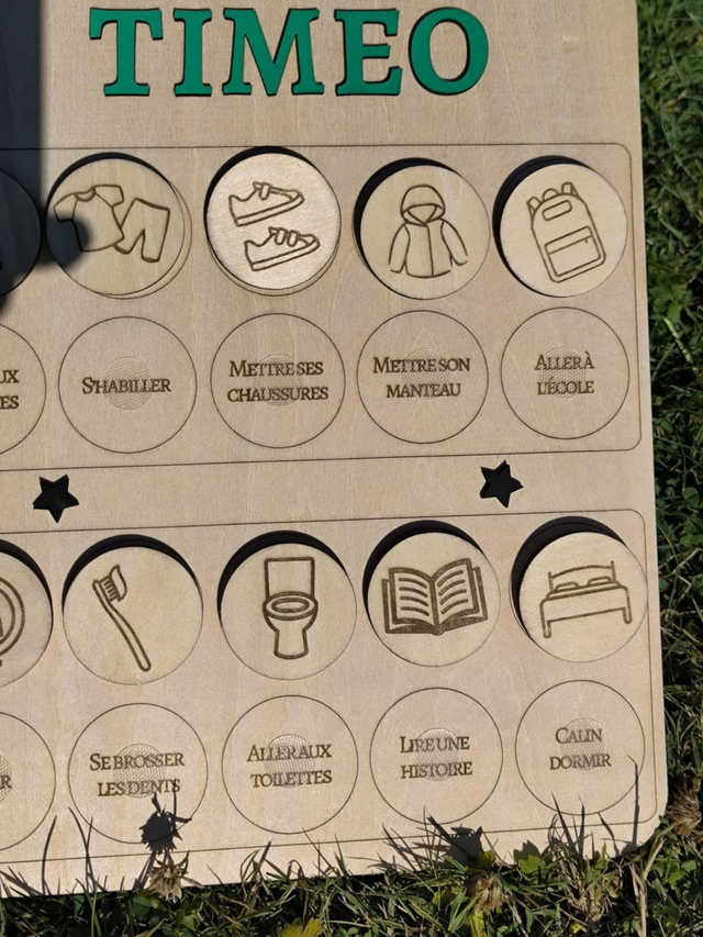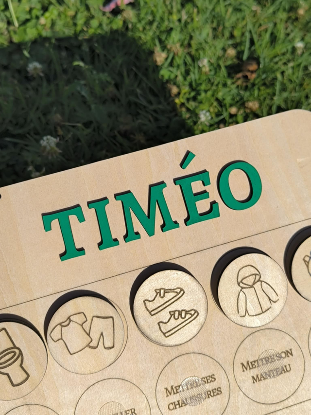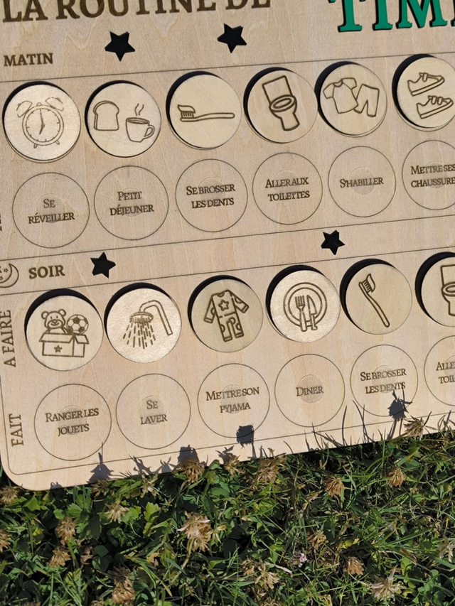 Un rituel plein de tendresse pour bien commencer et finir la journée 💫 Ce tableau de routine en bois accompagnera votre enfant pas à pas, du réveil au coucher. Idéal pour instaurer de bonnes habitudes dès le plus jeune âge, il l’aide à gagner en autonomie tout en s’amusant.🌟 Chaque action est illustrée : se réveiller, petit déjeuner, se laver, lire une histoire… Votre enfant déplace les jetons de "À faire" à "Fait" avec fierté !🔁 Routine modifiable selon votre mode de vie : possibilité d’ajouter, retirer ou remplacer certaines étapes pour qu’elle corresponde parfaitement à votre quotidien.🎨 Prénom gravé en couleur (au choix : bleu clair, bleu foncé, vert, rouge, rose ou noir)📐 Dimensions : env. 37cm largeur , 27.5cm hauteur , 3mm épaisseur➡️ Lors de la validation de votre panier, À droite il est écrit "Message l'attention du commerçant merci d’indiquer : prénom + modification routine si besoin📩 Pour toute question : 0664219396.