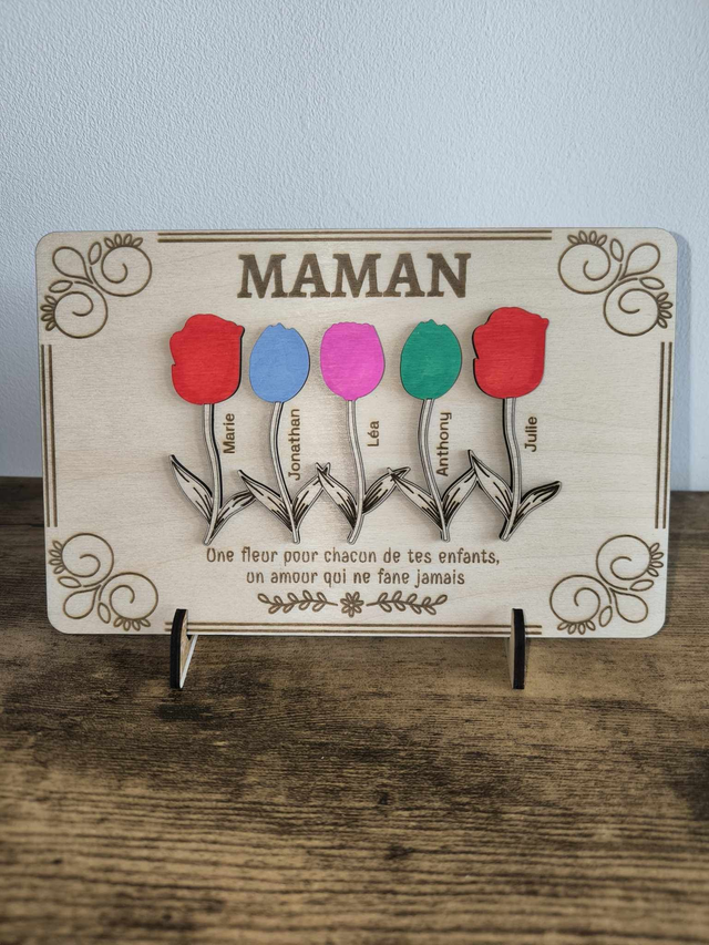 Pancarte sur pied décorée de tulipes, chaque fleur représentant un prénom d’enfant (de 2 à 9). Personnalisez également une phrase spéciale. En fonction du nombre d'enfants sur votre pancarte vous aurez du coup la couleur : rouge, bleu, rose, vert. Un souvenir coloré et touchant pour votre maman.📏 Dimensions : a venir➡️ Au moment de vouloir valider votre panier il est écrit à droite "Message à l'attention du commerçant". Merci de m'indiquer dans le cadre les informations suivantes : Si nécessaire, la phrase à modifier, ainsi que les prénoms avec les couleurs correspondante . (Pour des informations complémentaires envoyez-moi un message au 0664219396)