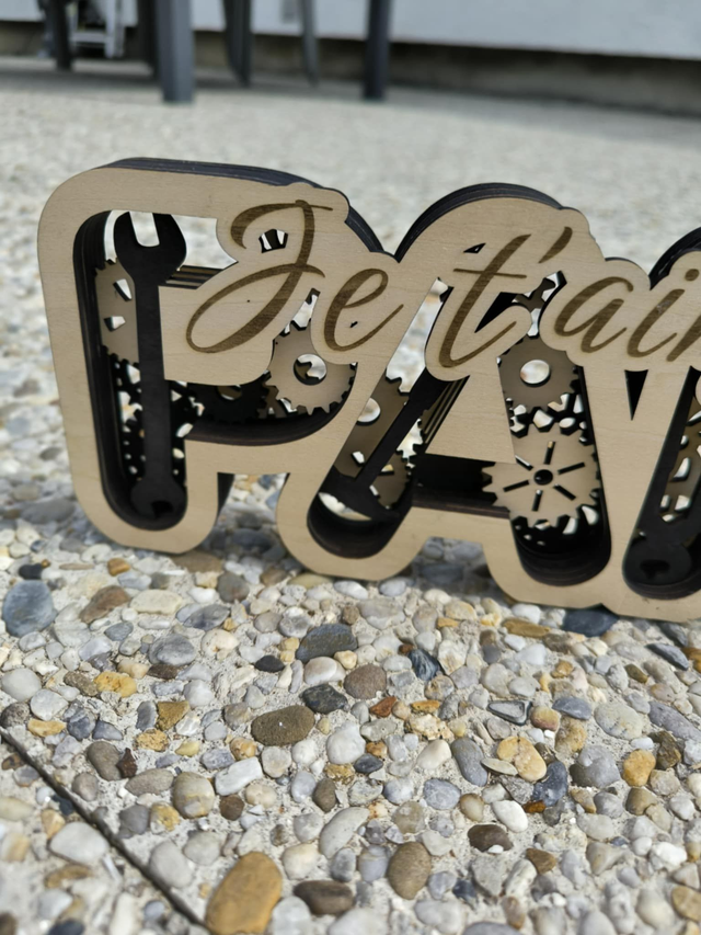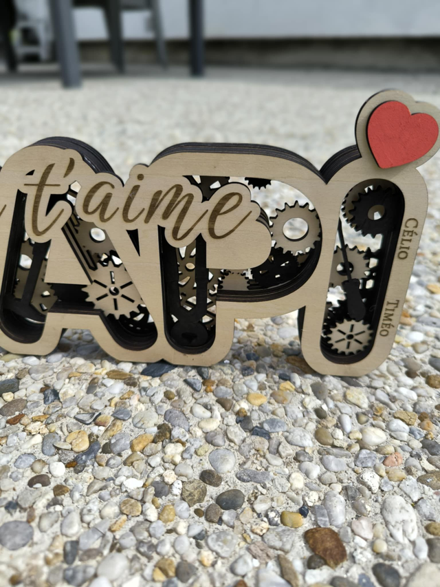 Faites plaisir pour la fete des grand-père avec ce magnifique panneau en bois gravé « Je t’aime Papi » ❤️ Un cadeau unique, rempli d’amour, idéal pour la Fête des Grands-Pères, un anniversaire, Noël ou simplement pour dire je t’aime 💛✨ Caractéristiques : 🌿 Bois naturel de qualité, découpé et gravé au laser 💖 Inscription « Je t’aime » en relief + petit cœur rouge peint 🧸 Motif ajouré original avec détails décoratifs ✍️ Personnalisation possible avec le prénom des petits-enfants📐 Dimensions : environ largeur : 29cm , hauteur : 14.5cm 🎨 Couleurs disponibles pour le cœur : rouge, jaune, bleu foncé , bleu clair , noir , rose, vert🎁 Un souvenir précieux à exposer sur une étagère, un bureau ou un meuble. Ce cadeau personnalisé fera briller les yeux de votre papi et restera un témoignage d’affection intemporel. ✨➡️ Avant la validation de votre panier a droite, merci d’indiquer :Le prénom à graver (si souhaité)Possible de me joindre également 0664219396