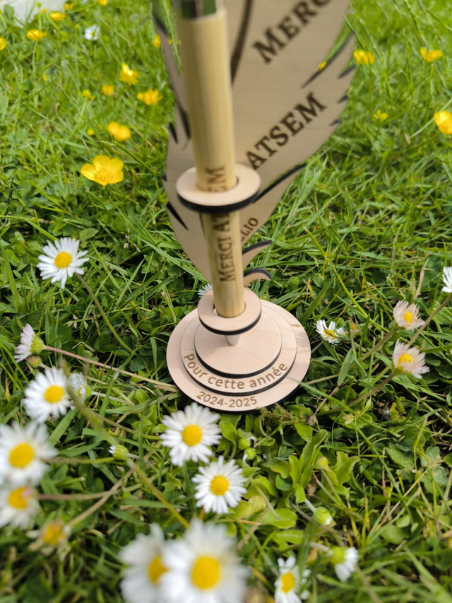 Offrez un joli clin d'œil plein de sens avec ce porte-plume en bois, un cadeau à la fois décoratif et rempli d’émotion ❤️La plume en bois est gravée avec un mot personnalisé (ex : "Merci Maîtresse", "Merci ATSEM", "Merci Sophie"…) accompagné du prénom de l’enfant qui offre le cadeau ✍️. En bas du support, une petite phrase (par défaut "Pour cette année 2024-2025", ou personnalisable) est gravée sur le pied.Un stylo est également inclus, avec une gravure au choix (mot doux ou prénom). Un cadeau original à poser sur un bureau pour garder un joli souvenir de l’année écoulée 🌟💡 Dimensions : env. hauteur: 16cm / largeur: 6cm➡️ Lors de la validation de votre panier, à droite "Message à l'attention du commerçant" :merci d’indiquer le texte à graver sur la plume (ex : "Merci Maîtresse + prénom de l’enfant"), le texte pour le stylo, et la petite phrase à graver en bas (ou laisser celle par défaut).📩 Pour toute question : 0664219396.