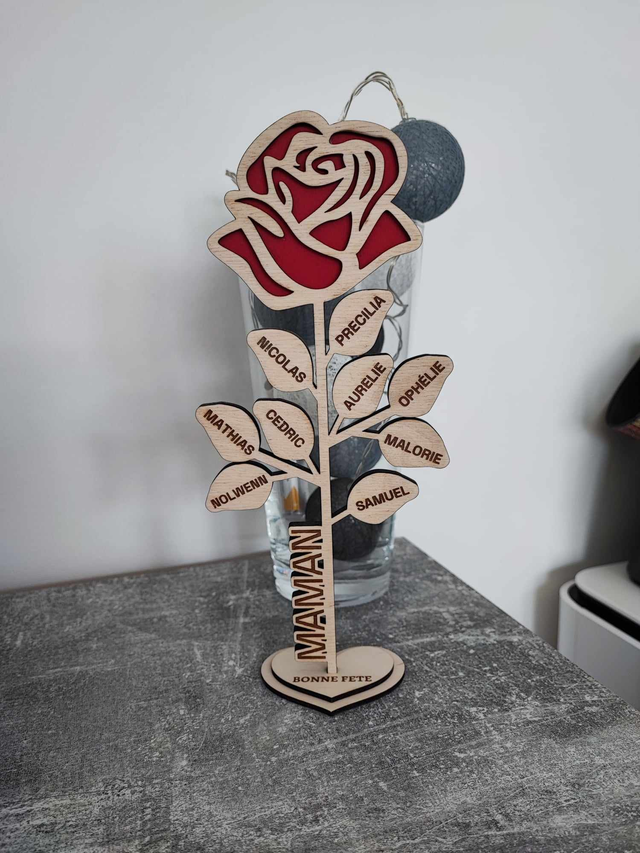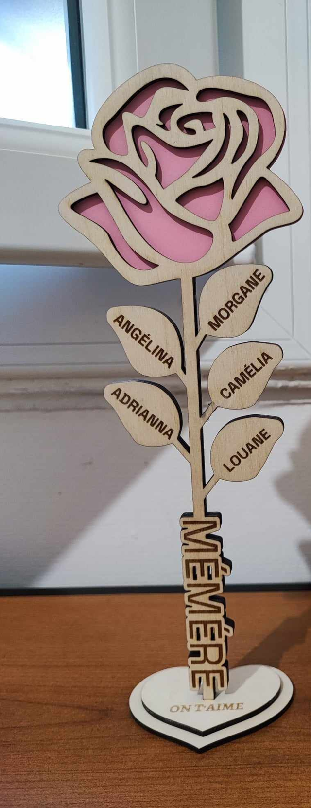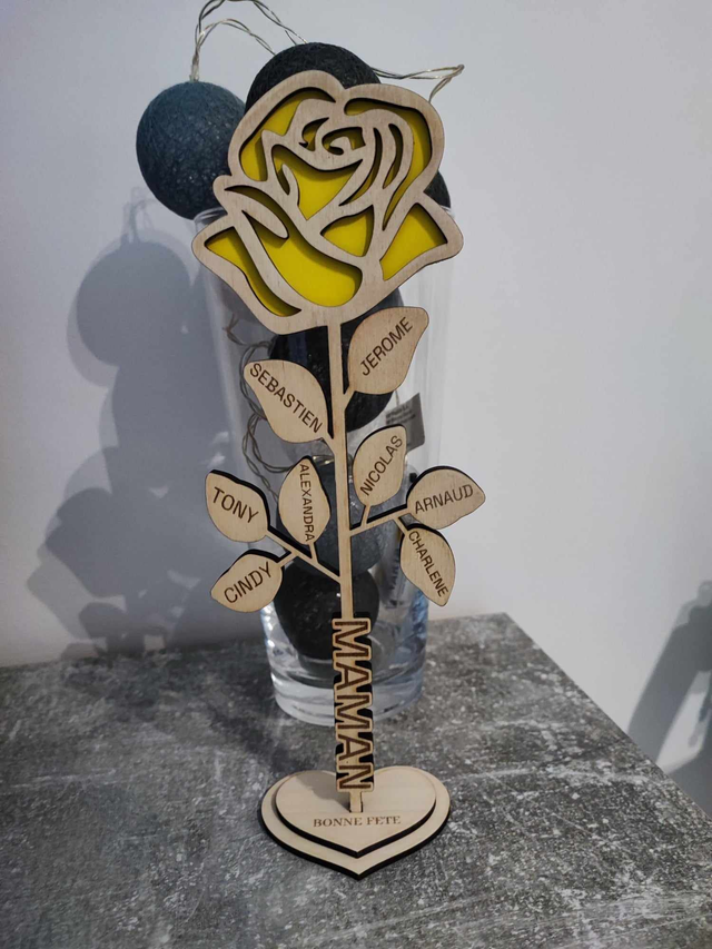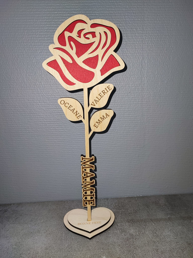 Rose relief Avec prénom (9max) sur les pétales Avec pied Largeur 10cm / hauteur 28.3cm Au moment de vouloir valider votre panier il est écrit "Message à l'attention du commerçant" Merci de m'indiquer dans le cadre les informations suivantes : les prénoms des pétales, ainsi si vous avez choisi l'option "Autre" merci de m'indiquer le mot que vous souhaitez sur la tige (pour des informations complémentaires envoyez-moi un message au 0664219396)